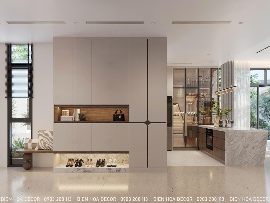 Khu vực sảnh được thiết kế tủ giày kịch trần hiện đại, tăng tối đa diện tích lưu trữ. Điểm nhấn là kệ trang trí vân gỗ kết hợp đèn LED, tạo chiều sâu và cảm giác cao cấp. Phần dưới bố trí khoang để giày tiện dụng, giúp không gian luôn ngăn nắp.