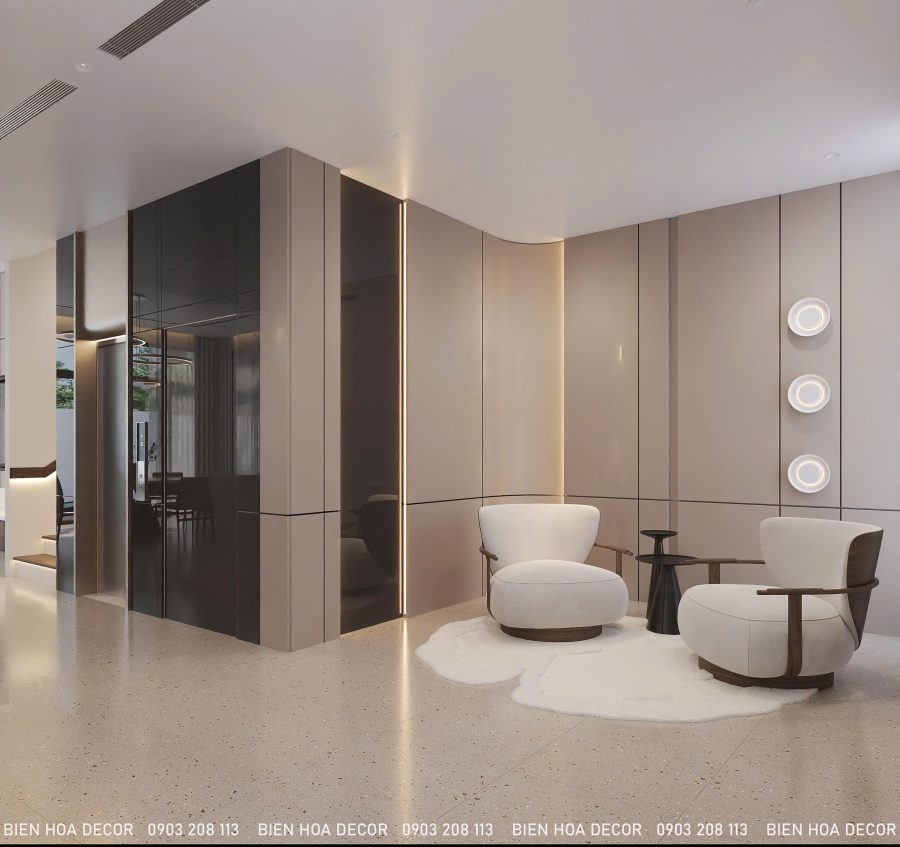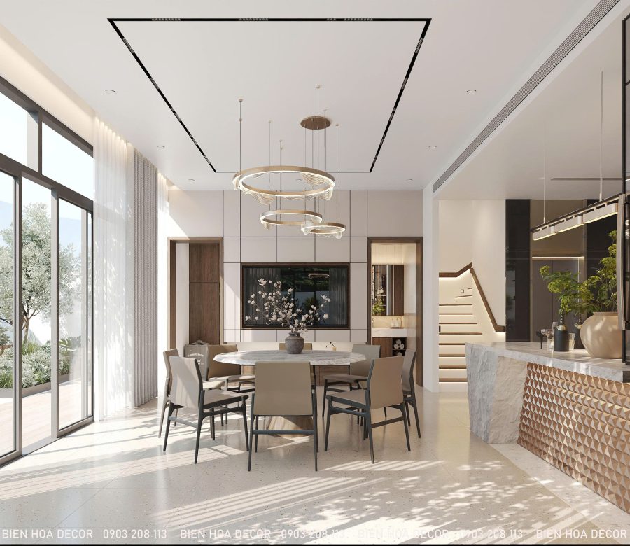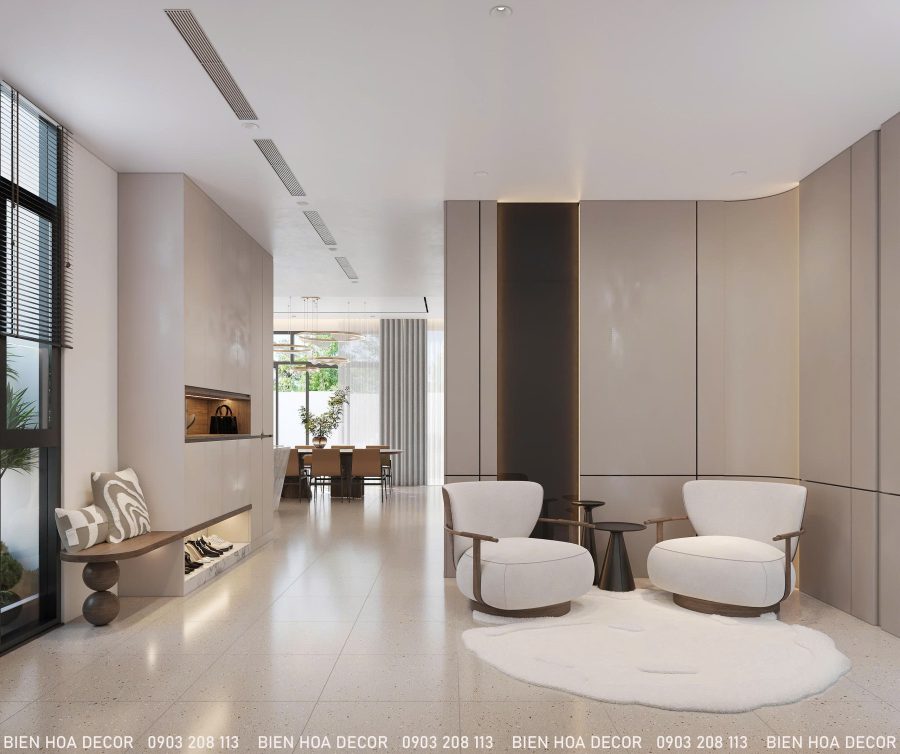 Dự án thiết kế nội thất biệt thự lần này của Bienhoadecor mang phong cách hiện đại tối giản, sử dụng gam màu trung tính kết hợp gỗ và đá, tạo nên tổng thể tinh tế, sang trọng và thoáng rộng.