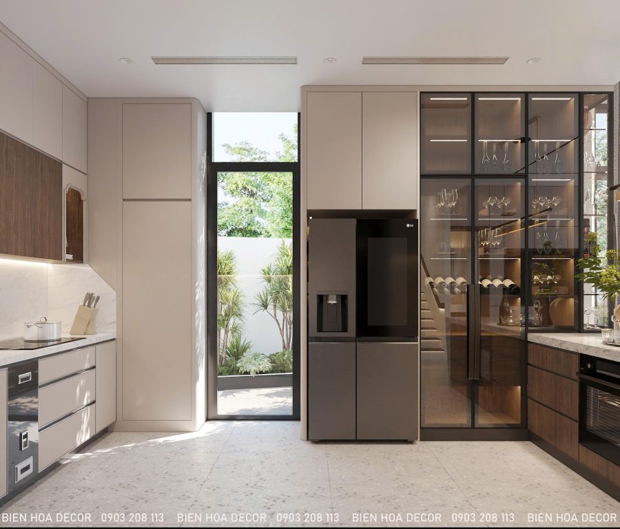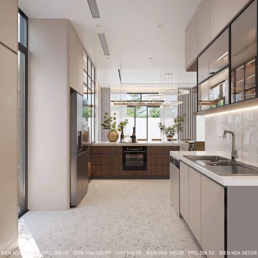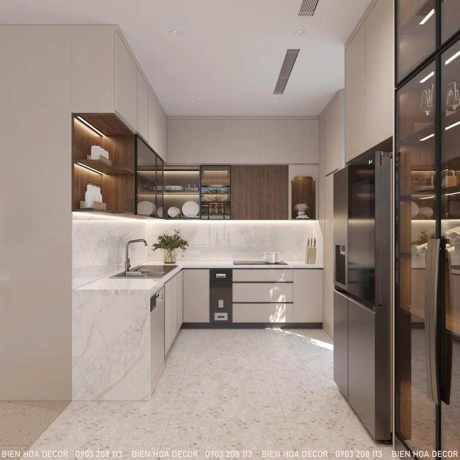 TỦ BẾP HIỆN ĐẠI – ĐẲNG CẤP VÀ TIỆN NGHIKhu vực bếp nổi bật với tủ bếp chữ L kết hợp mặt đá sáng màu, sạch sẽ và dễ vệ sinh. Hệ tủ kính khung đen cùng ánh sáng LED tạo điểm nhấn sang trọng, đồng thời giúp không gian bếp gọn gàng và tối ưu công năng sử dụng.